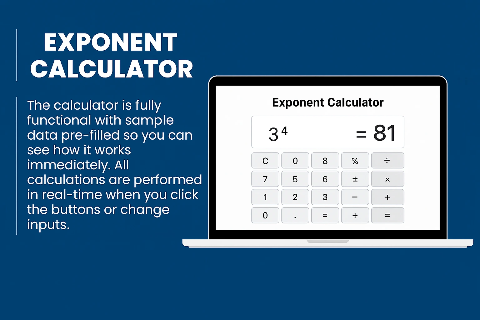 Use our free Exponent Calculator to calculate powers, squares, cubes, and exponential values instantly. Whether you need to find 2³, 5², or e⁴, this tool gives quick and accurate results for math, physics, and engineering applications.